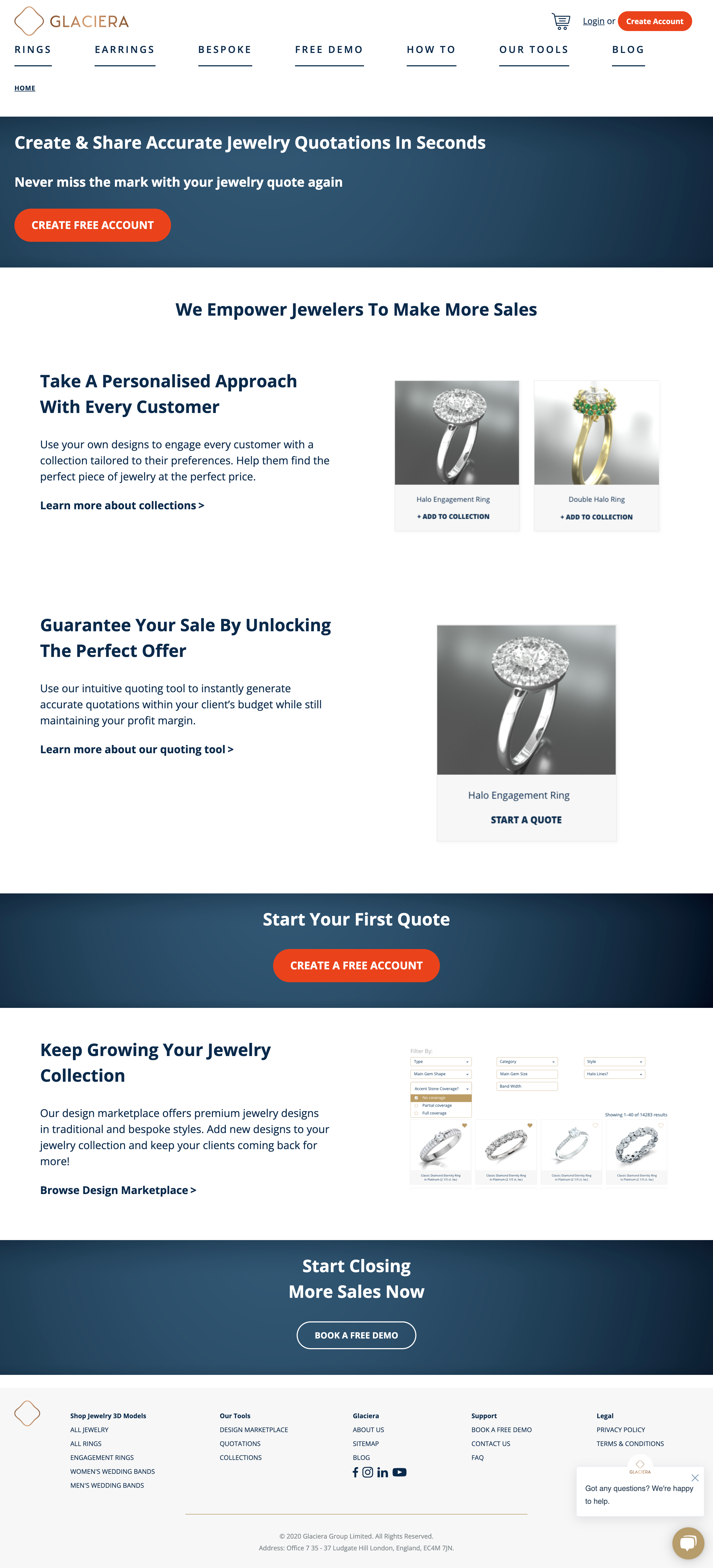 Glaciera is a product for Jewellery businesses – boosting their sales to customers. Glaciera offers a 3d model design marketplace with purchasable 3d models, design calculator and quotation builder and a client collection tool to help make client sales of custom Jewellery pieces.